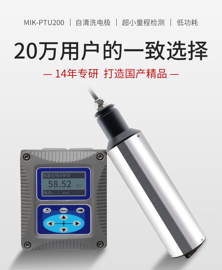 MIK-PTU300浊度在线分析仪是针对饮用水水质在线监测,量身研发的具有自主 知识产权的专利产品,具有超低浊度检出限、高精度测量、设备长时间 免维护、省水工作和数字化输出的特点,支持云平台和手机移动端数据 远程监控,以及 RS485-modbus 通讯,可广泛应用于自来水出厂水、二次 供水、管网末梢水、直饮水、膜过滤水、游泳池、地表水等浊度在线监测。